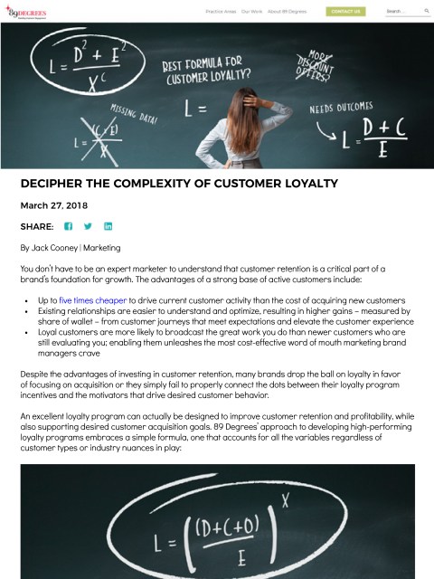 Blog Post Customer Loyalty Article for 89 Degrees Blog Wrote this blog post to draw attention to our redesigned website and new focus on the Loyalty Program practice area. Related